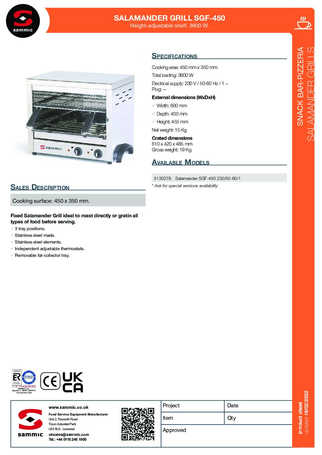 Sammic Fixed Salamander Grill SGF-450 is part of the range of quality Salamander Grills from Sammic.