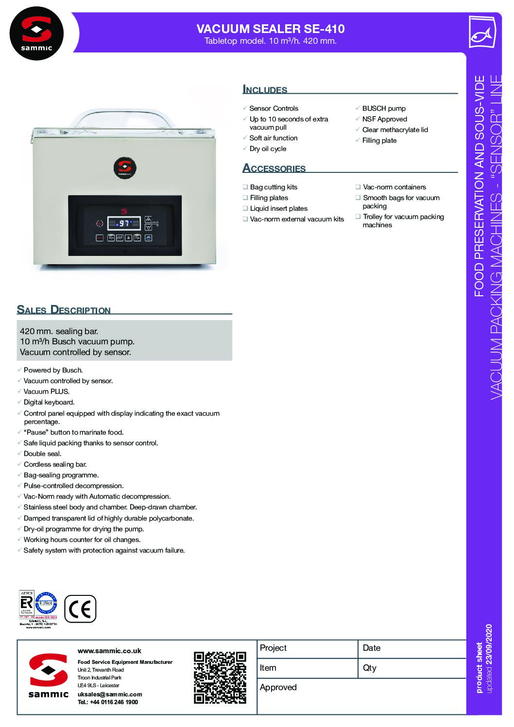 Sammic SE-410 Table Top Vacuum Packing Machine (420mm/17″ sealing bar) is part of the Sammic “Sensor line” SE 400 Series of highly precise vacuum packing machines comprising of three models – SE-410, SE-416 & SE-420. All of these tabletop models have a sealing bar length of 420mm/17″ and have varying pump capacities.