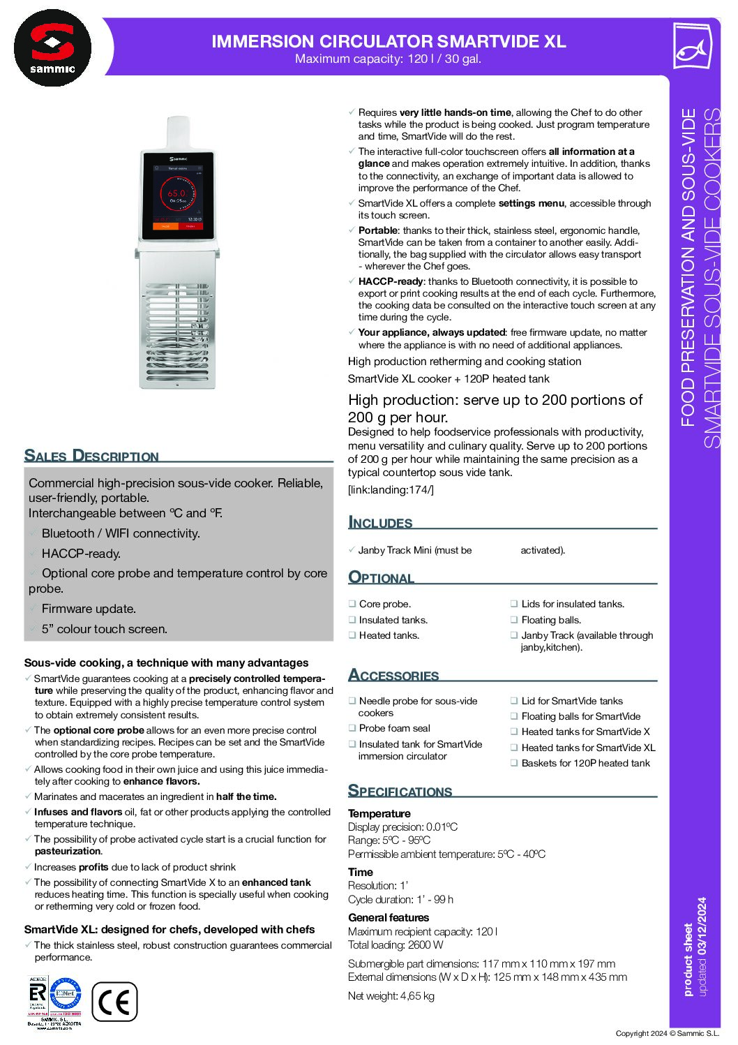 Sammic SmartVide XL Immersion Circulator Cooker (120L/30Gal) is part of the updated range of commercial high-precision sous-vide cookers from Sammic. Reliable and user-friendly, a portable cooker designed for chefs, developed with chefs.
