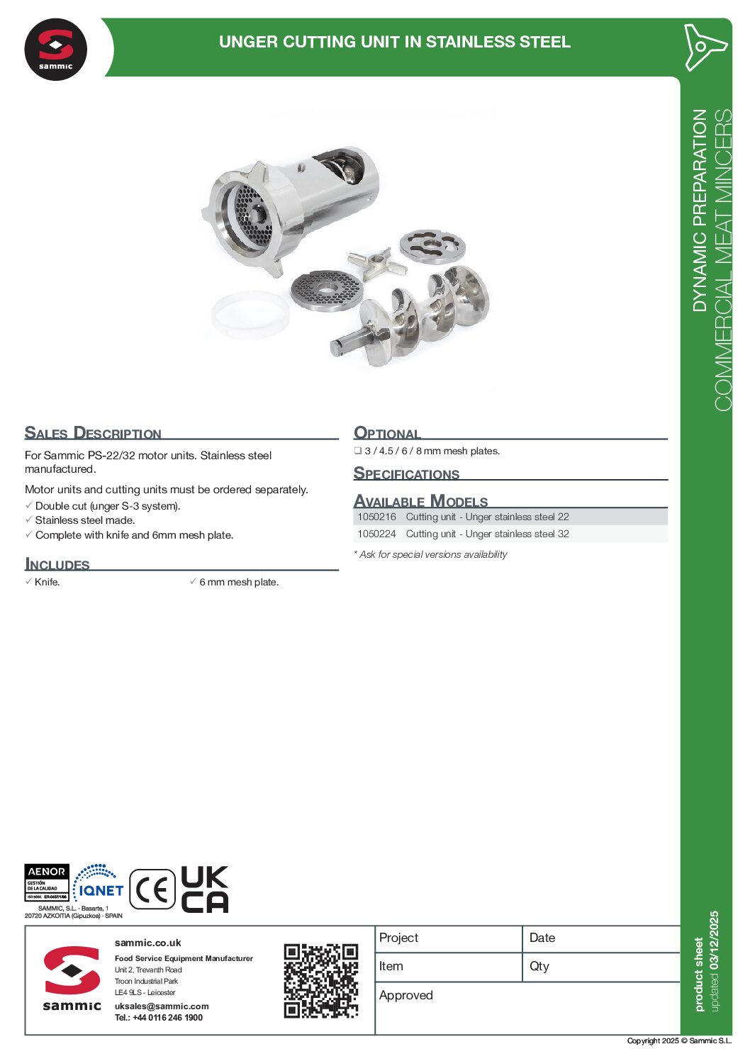 The Sammic Stainless Steel Unger Cutting Unit is designed for use with Sammic PS-22 and PS-32 motor units, offering a durable, hygienic and high-performance cutting system for professional meat preparation. Featuring the Unger S-3 double-cut system, it delivers a consistent mince texture and is easy to dismantle, clean and reassemble between batches. This stainless steel assembly is ideal for butchers, commercial kitchens and production environments requiring reliable, repeated throughput.