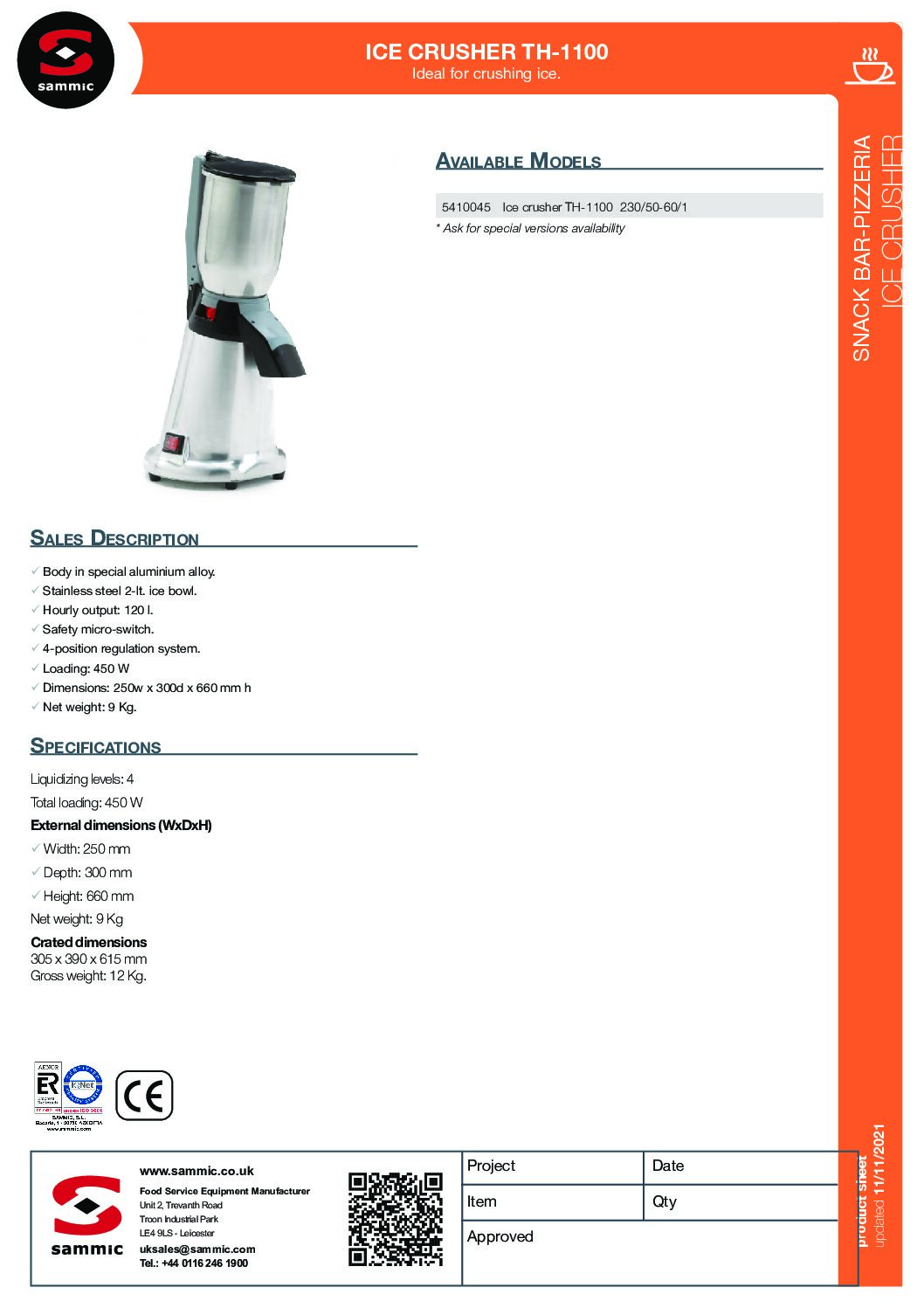 Sammic TH-1100 Ice Crusher/Blender is an electric, commercial ice blender made of best quality stainless steel.