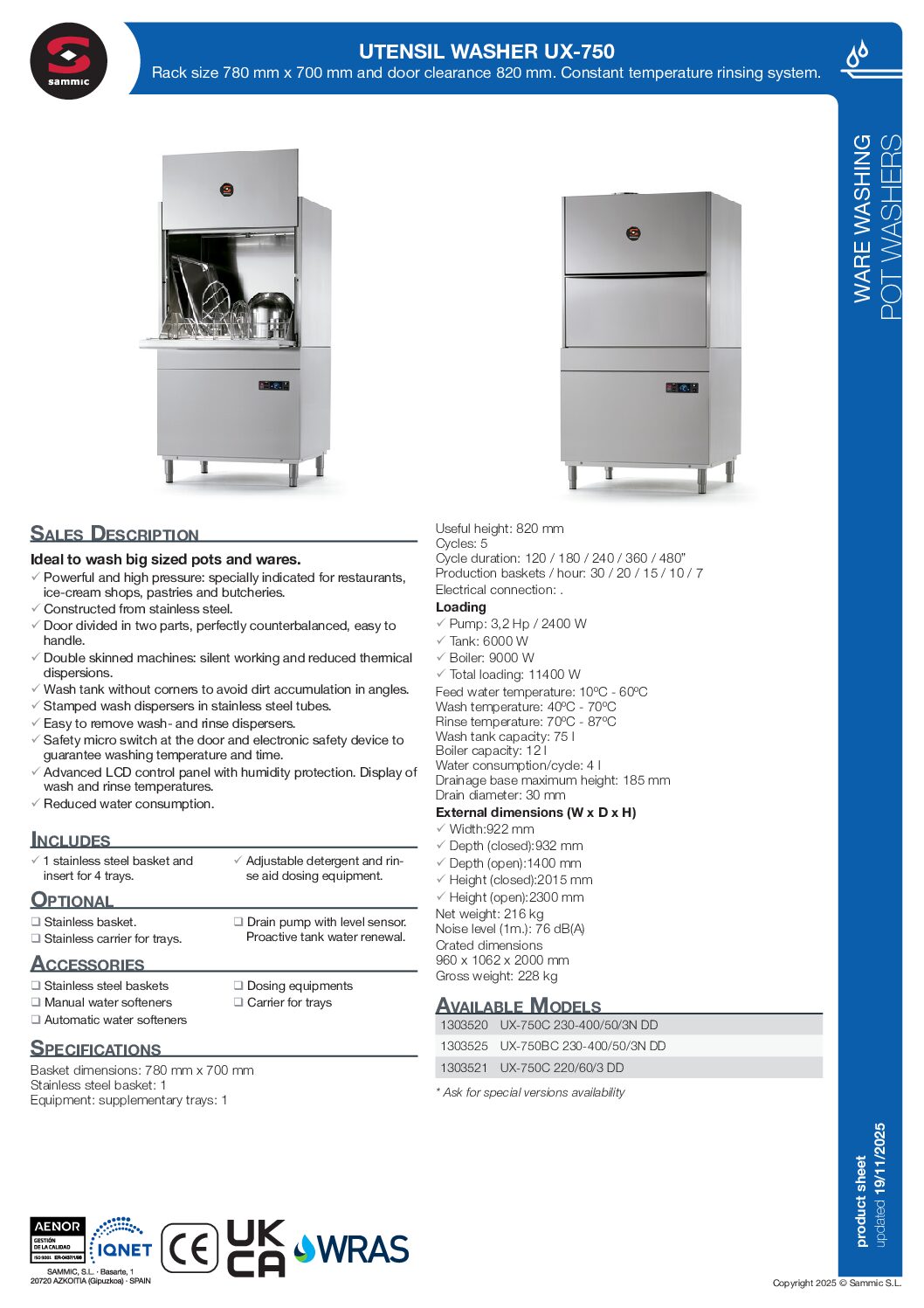 The Sammic UX-750 is a heavy-duty utensil washer and pot washer designed for high-volume commercial kitchens washing the largest pots, trays, racks and GN containers throughout the day. With an extra-large 780 x 700 mm rack, an 820 mm useful loading height and a constant-temperature rinsing system, it delivers powerful, hygienic wash results on oversized and heavily soiled cookware in restaurants, hotels, bakeries, patisseries, ice-cream shops and butcheries.