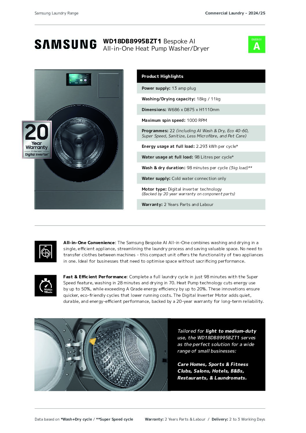 The Samsung Bespoke AI All-in-One WD18DB8995BZT1 is a cutting-edge washer dryer designed for environments where space, efficiency and performance matter most. Combining generous 18 kg washing and 11 kg drying capacities, this advanced appliance delivers high-performance laundry care within a single compact footprint.