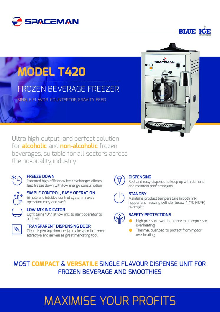 The Spaceman T420 is a compact, single-flavour frozen beverage freezer designed for high-throughput milkshakes, smoothies and frozen cocktails. A gravity-fed cylinder and a high-efficiency heat exchanger deliver quick freeze-down with low energy use, while the body-mounted spinner (included) lets you blend flavour add-ins to order. Transparent dispensing door, low-mix alerts and standby mode keep service smooth throughout the day and overnight.