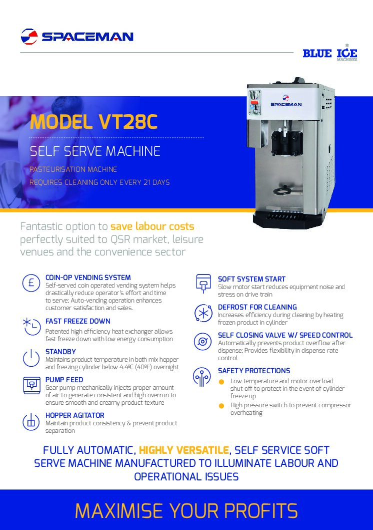 The Spaceman VT28C is the new and improved version of the original coin-operated model, now upgraded with simple push-button self-serve operation. Customers simply buy a cup or cone at the till and press to dispense their ice cream. This straightforward system makes it ideal for leisure venues, cinemas, retail outlets, and other busy sites where speed, hygiene, and customer experience are key. In addition, the built-in pasteurisation system keeps product safe and fresh for longer, while reducing the frequency of cleaning required.