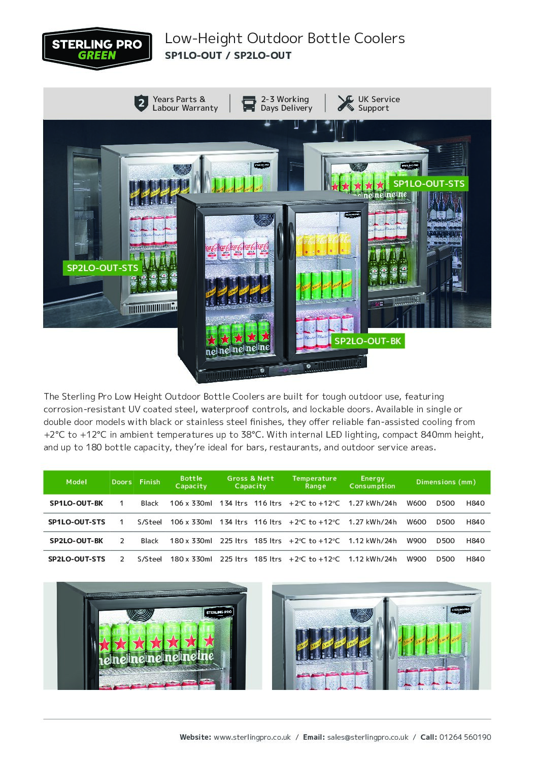 Part of the Sterling Pro Green range, it uses R600a refrigerant for efficient cooling. Internal LED lighting ensures contents remain visible during evening service.
