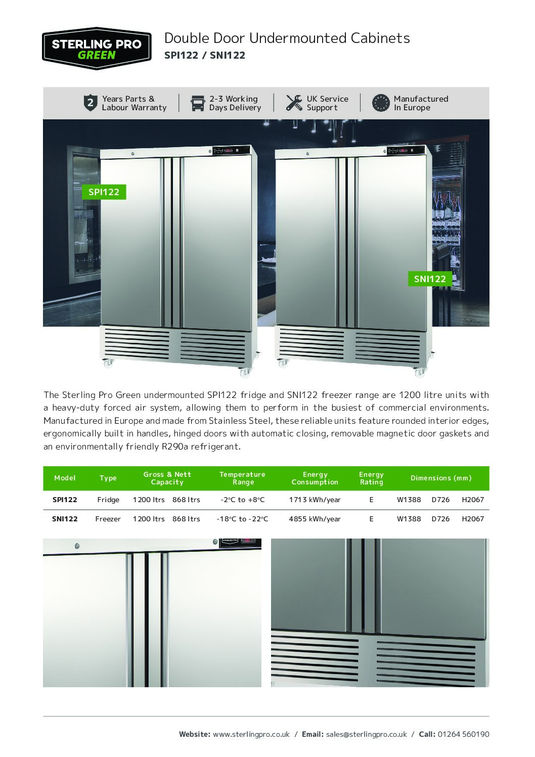 Manufactured in Europe and constructed from stainless steel inside and out, the SPI122 is built for durability, hygiene and everyday usability. Rounded internal edges support easier cleaning, while ergonomic full-length handles help reduce dirt build-up during frequent use. Forced-air cooling ensures even temperature distribution throughout the cabinet for reliable food storage.