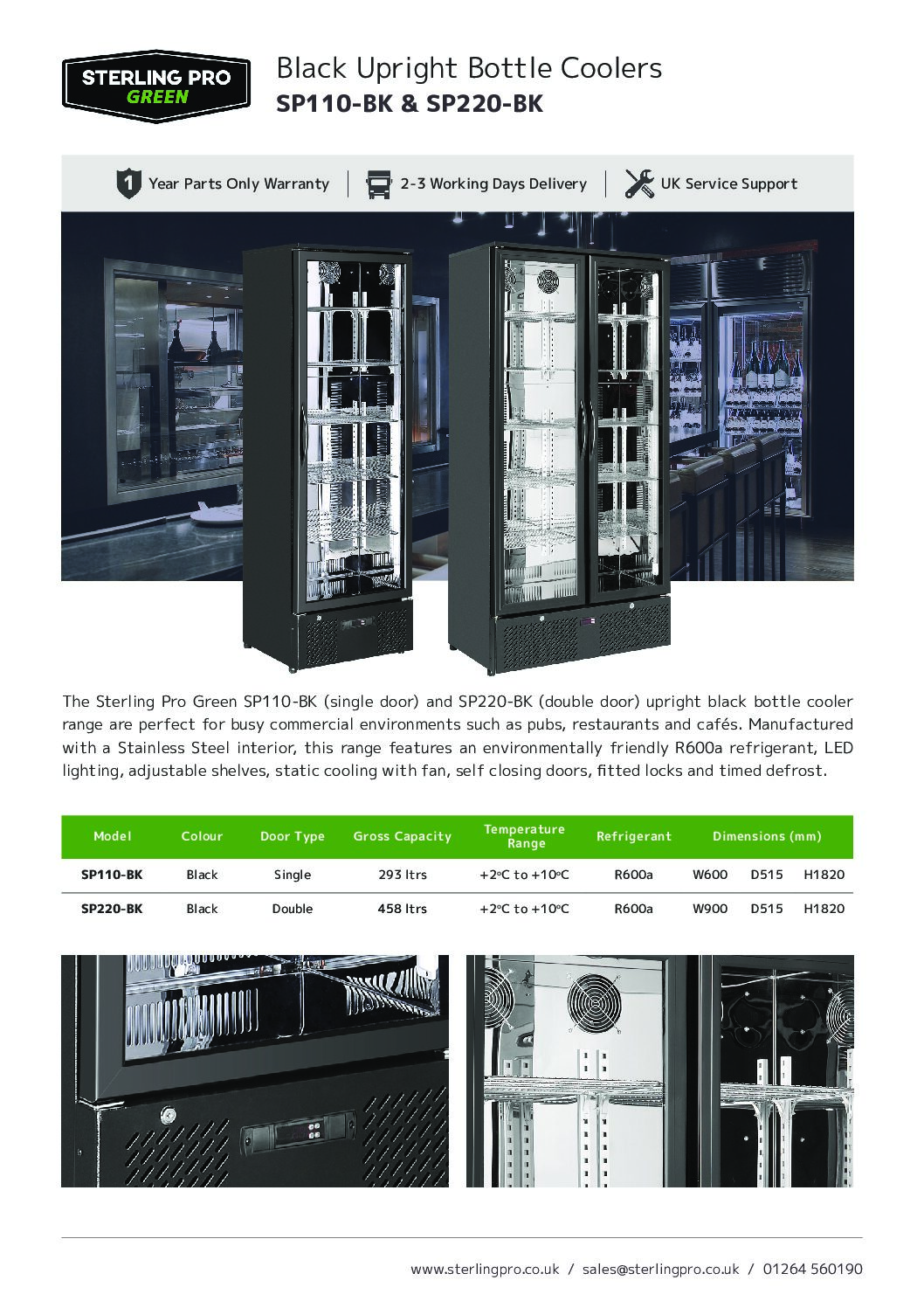 Sterling Pro SP110-BK Single Door Upright Bottle Cooler 293L is part of the latest range of bottle coolers in the new innovative Green range, perfect for busy commercial environments such as pubs, restaurants and cafés. Manufactured with a Stainless Steel interior, the SP100-BK features an environmentally friendly R600a refrigerant, static cooling with fan, self closing doors, fitted locks and timed defrost as standard.