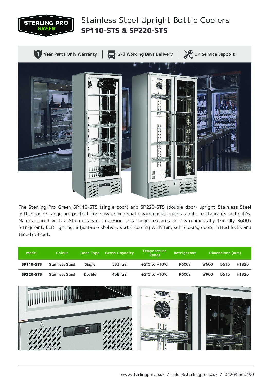 Sterling Pro SP110-STS Single Door Upright Bottle Cooler 293L is part of the latest range of bottle coolers from Sterling Pro in the new innovative Green range, perfect for busy commercial environments such as pubs, restaurants and cafés. Manufactured with a Stainless Steel interior, this range features an environmentally friendly R600a refrigerant, static cooling with fan, self closing doors, fitted locks and timed defrost as standard.