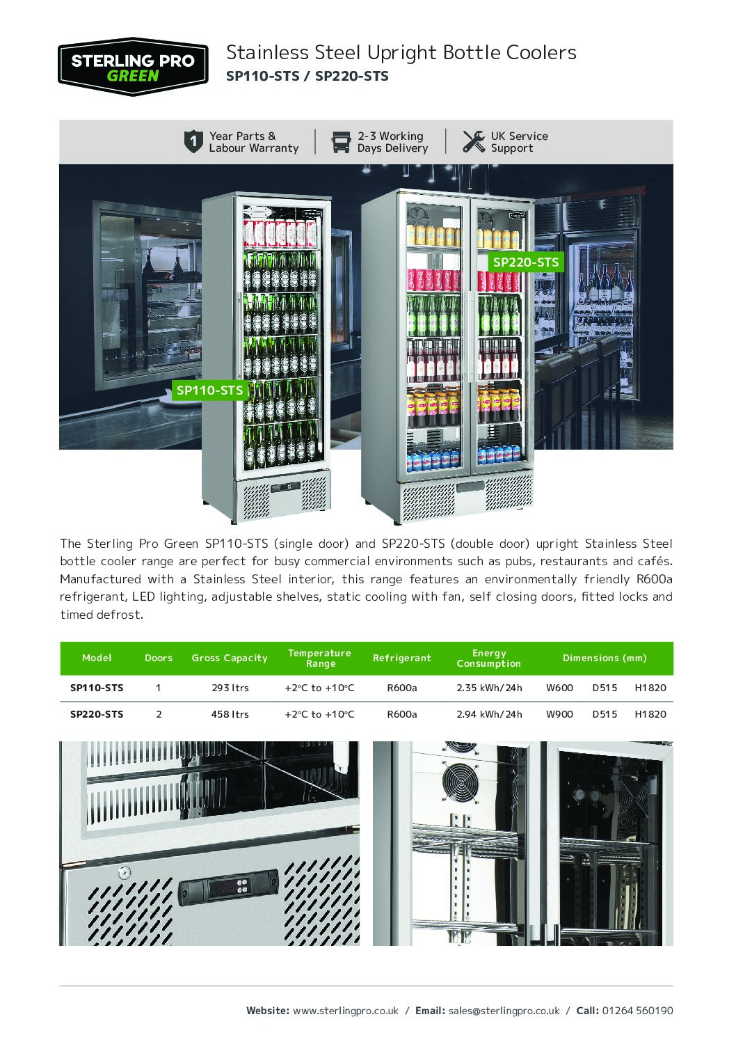 Professional presentation meets lasting performance. The Sterling Pro Green SP220-STS Double-Door Upright Bottle Cooler is purpose-built for busy commercial environments where appearance and reliability matter. Its full stainless-steel interior and exterior give a clean, professional look while offering the durability needed for continuous front-of-house service.