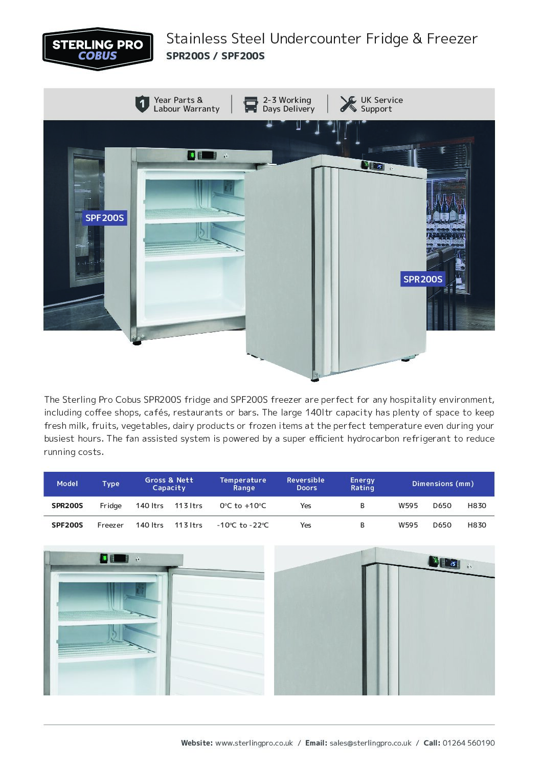 Sterling Pro SPF200S Single Door Stainless Steel Undercounter Freezer 140L is constructed of catering-grade stainless steel with a large 140L capacity in a very convenient compact footprint. Part of the Stirling Pro Cobus range of undercounter and upright fridges and freezers of varying capacities, ideal for most food preparation areas.