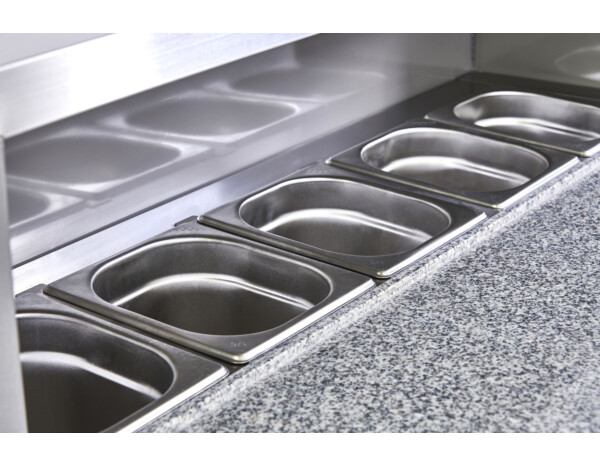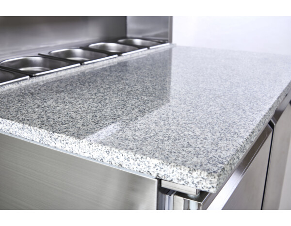 - Granite preparation surface with rear refrigerated topping unit (5 × GN 1/6 — pans not included).