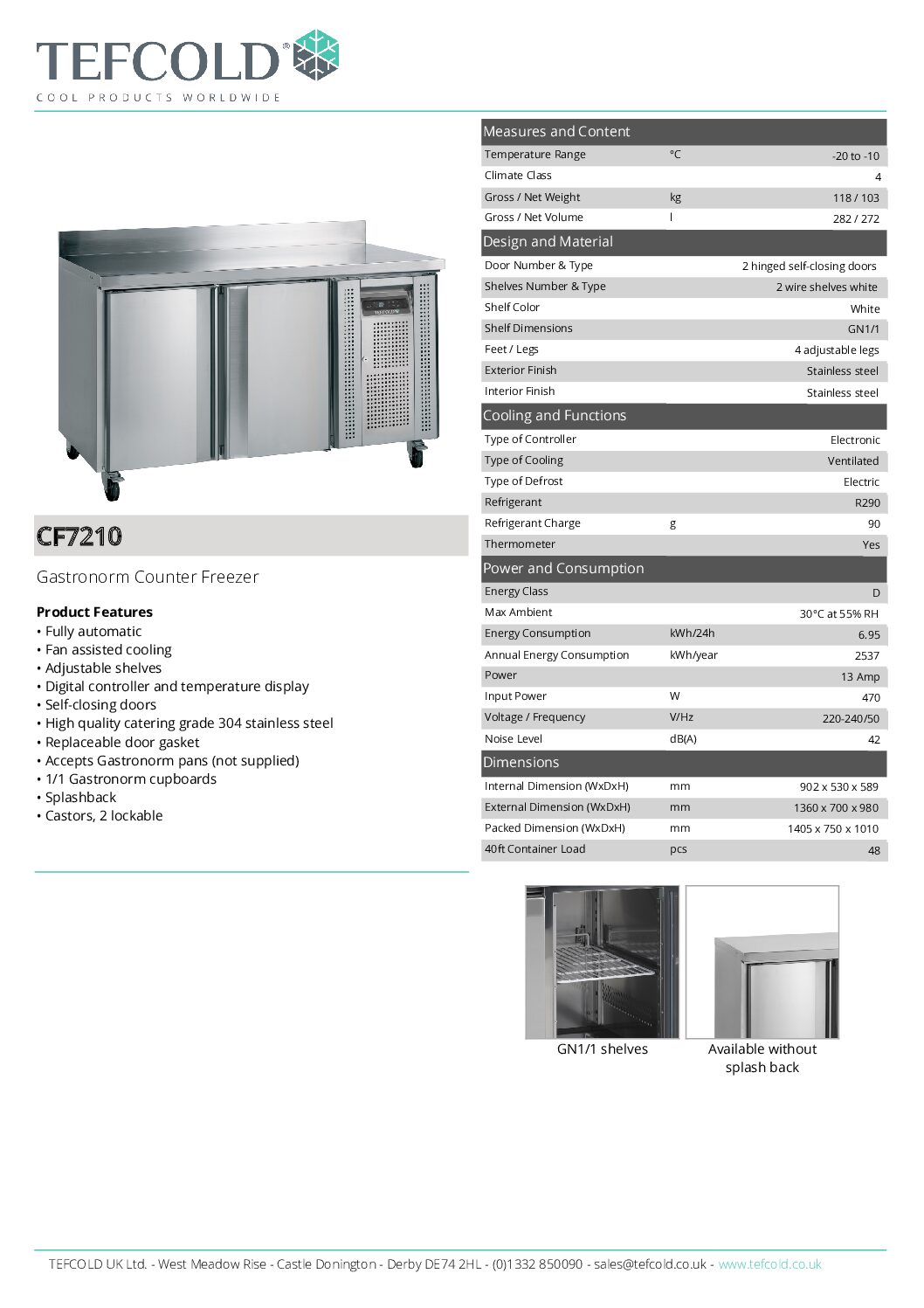 Tefcold CF7210 SS 2 Door Gastronorm Counter Freezer 282L is from the leading Brand Tefcold. This counter is fully constructed in Stainless Steel with 1 x 1/1 gastronorm shelf per door, splashback fitted as standard, digital temperature display and fan assisted cooling.