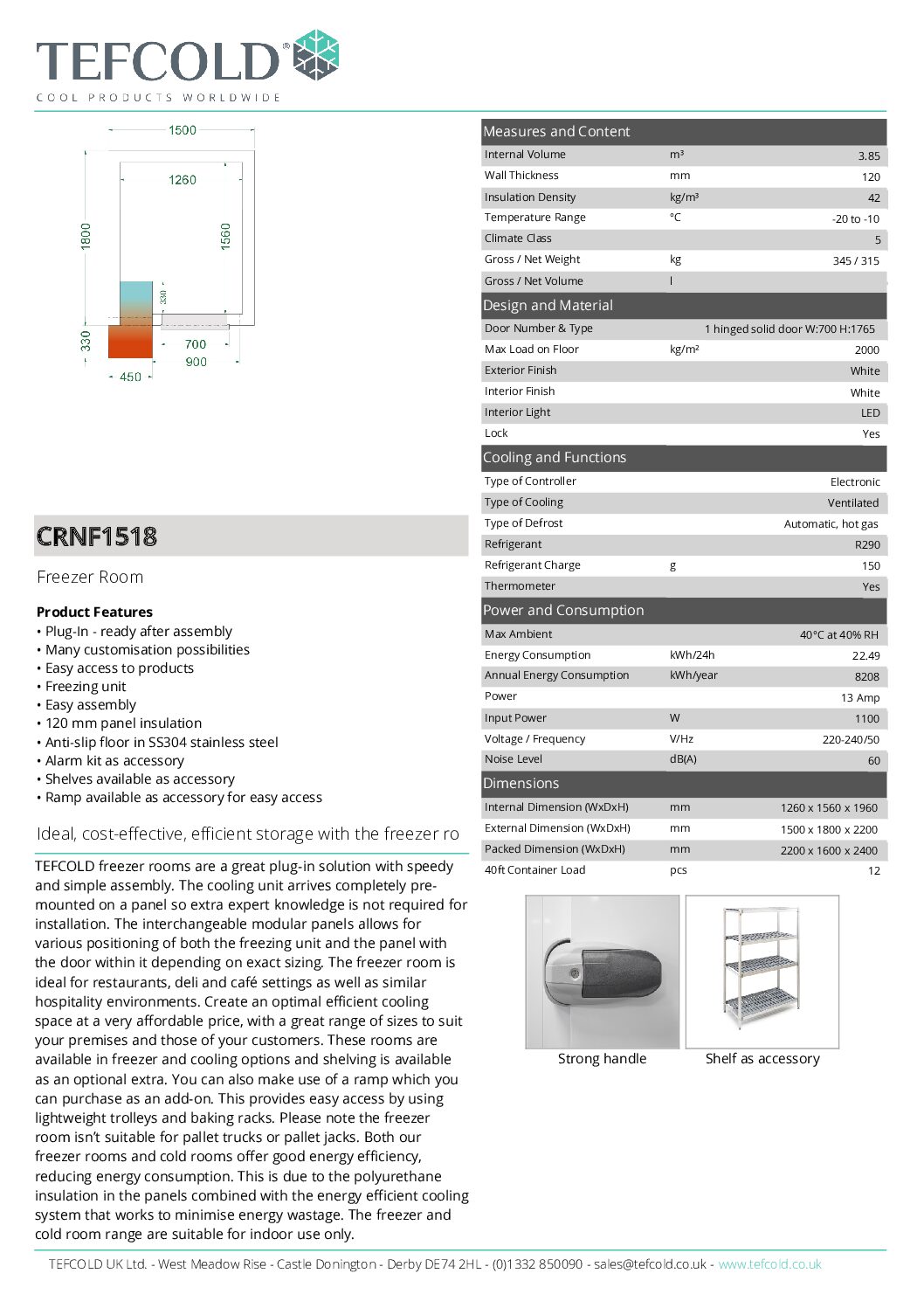 Tefcold CRNF1518 Coldroom (Freezer) is a walk-in freezer, perfect for larger catering businesses and foodservice operations where storage and access to large quantities of frozen food and drink products is required. These units have been developed with modern catering and hospitality environments in mind. They all have stainless steel floors and heated door frames as standard, and you can purchase with optional free-standing shelving.