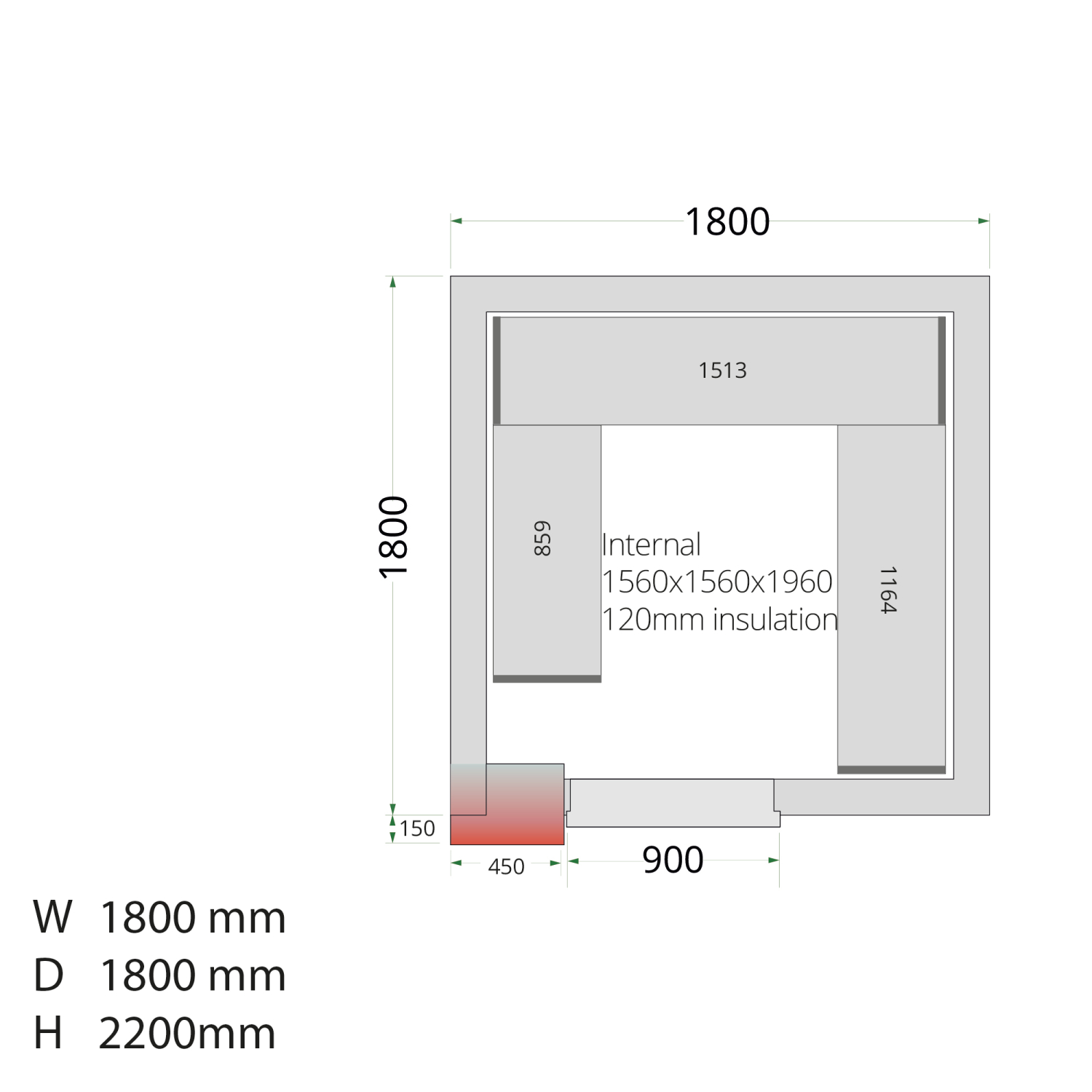CRNF1815: 1800mm (w) x 1500mm (d) x 2200mm (h)