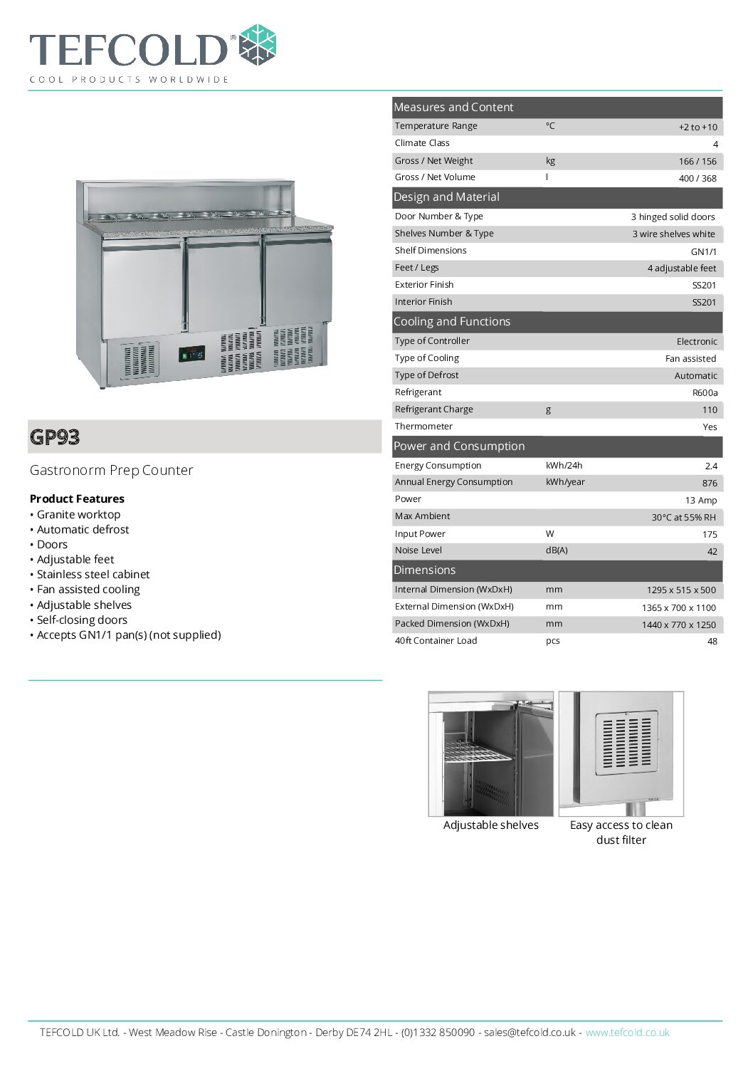 Tefcold GP93 3 Door Stainless Steel Refrigerated Pizza/Saladette Prep Counter With Granite Top, 400L is a fully automatic unit that boasts a spacious 400L capacity and a wet wall fan-assisted cooling system to ensure consistent chilled temperatures for your ingredients. The stainless steel construction offers both durability and easy cleaning, while the granite worktop provides a premium work surface. For maximum flexibility, the GP93 features adjustable shelves and feet, and accepts Gastro pans (sold separately). It even includes a Gastronorm well for additional storage, holding up to eight 1/6 GN pans at a maximum depth of 150mm (pans not included). The GP93 boasts self-closing doors with replaceable gaskets for superior hygiene and temperature control, all managed by a convenient digital controller and temperature display.