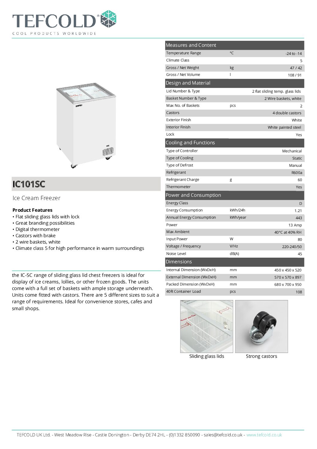 Tefcold IC101SC Sliding Flat Glass Lid Ice Cream Freezer 108L is part of the IC-SC range of sliding glass lid chest freezers, ideal for displaying ice creams, lollies, or other frozen goods. The units come with a full set of baskets and ample storage underneath. They are fitted with castors for mobility. With five different sizes available, there’s an option to suit various needs. Perfect for convenience stores, cafes, and small shops.