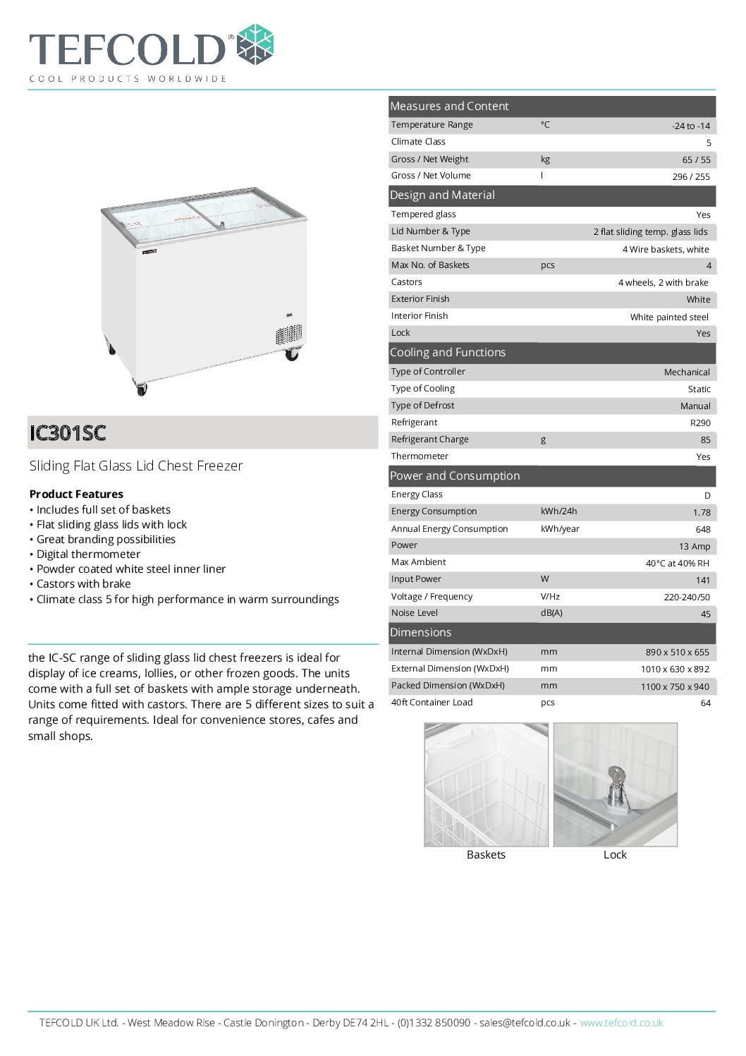 Tefcold IC301SC Sliding Flat Glass Lid Chest Freezer 296L is part of the IC-SC range of sliding glass lid chest freezers, ideal for displaying ice creams, lollies, or other frozen goods. The units come with a full set of baskets and ample storage underneath. They are fitted with castors for mobility. With five different sizes available, there’s an option to suit various needs. Perfect for convenience stores, cafes, and small shops.