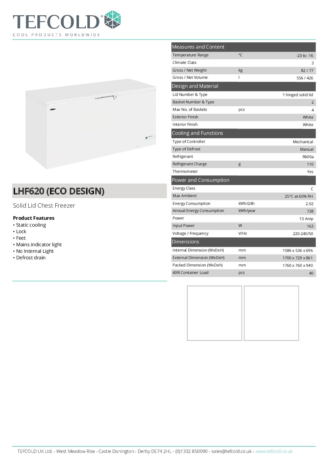 Tefcold LHF620 Chest Freezer 556L is able to consistently hold even temperatures to ensure your frozen stock remains at the correct temperature. This chest freezer features a solid lid ensuring an excellent seal thus increasing energy efficiency, a smart white exterior to suit any surroundings, a hammered aluminum interior and it comes with 2 internal storage baskets.