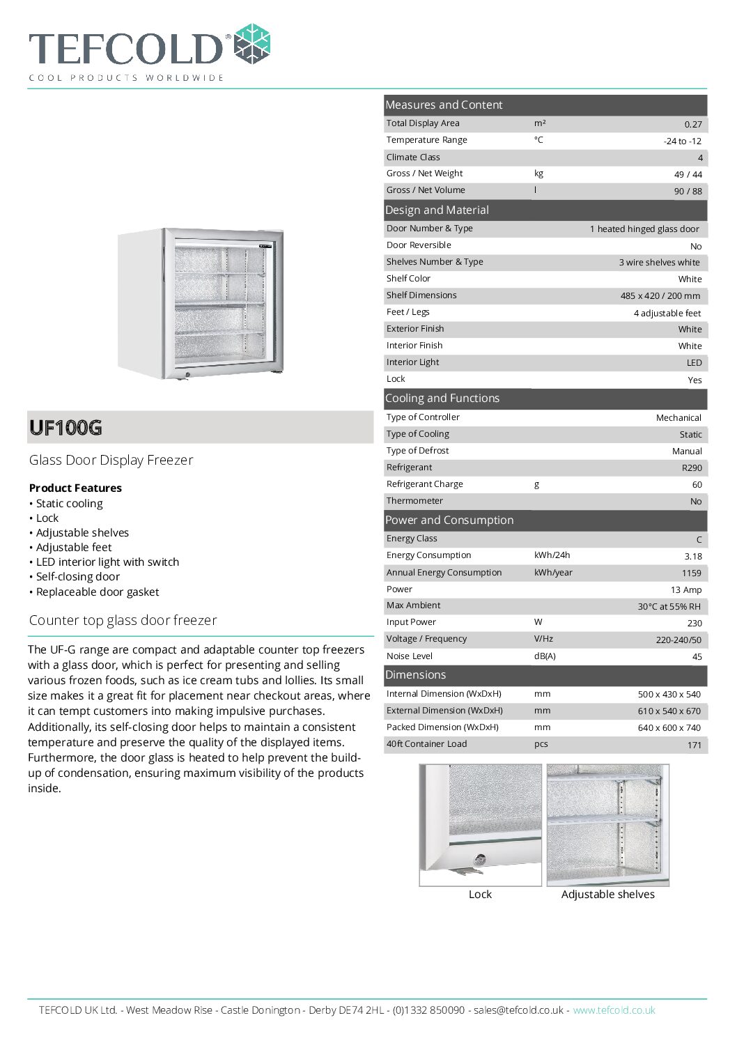 Tefcold UF100G Countertop White Glass Door Display Freezer, 90L is part of the UF-G range of compact and adaptable counter top freezers with a glass door, which is perfect for presenting and selling various frozen foods, such as ice cream tubs and lollies. Its small size makes it a great fit for placement near checkout areas, where it can tempt customers into making impulsive purchases. Additionally, its self-closing door helps to maintain a consistent temperature and preserve the quality of the displayed items. Furthermore, the door glass is heated to help prevent the build-up of condensation, ensuring maximum visibility of the products inside.