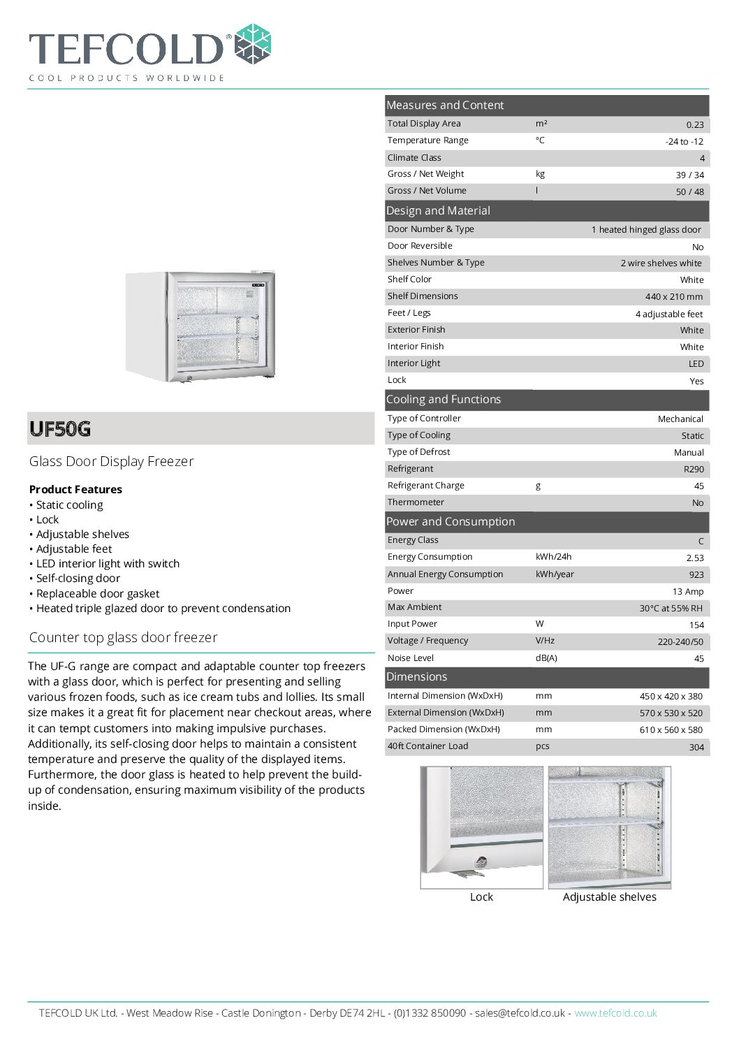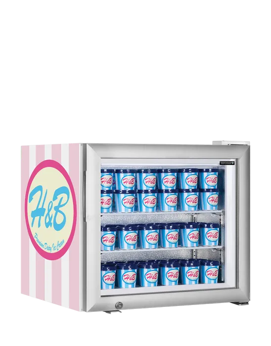 Tefcold UF50G Countertop White Glass Door Display Freezer, 50L is part of the UF-G range of compact and adaptable counter top freezers with a glass door, which is perfect for presenting and selling various frozen foods, such as ice cream tubs and lollies. Its small size makes it a great fit for placement near checkout areas, where it can tempt customers into making impulsive purchases. Additionally, its self-closing door helps to maintain a consistent temperature and preserve the quality of the displayed items. Furthermore, the door glass is heated to help prevent the build-up of condensation, ensuring maximum visibility of the products inside.