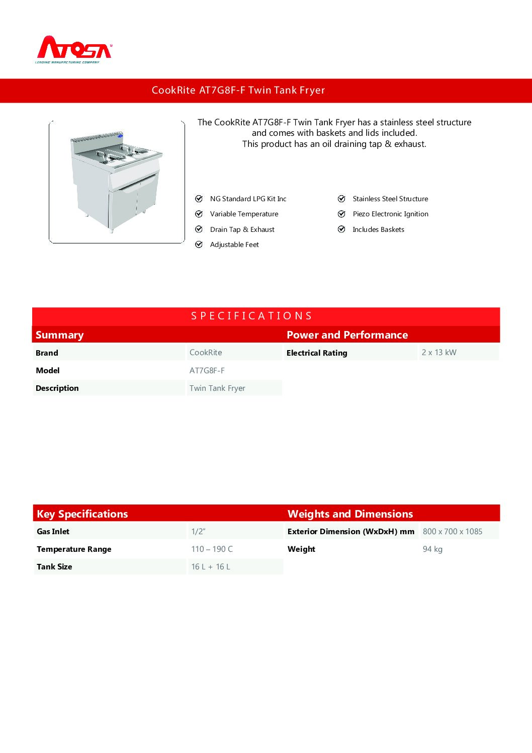 The Atosa CookRite AT7G8F-F is a powerful floor-standing twin tank gas fryer, designed for busy commercial kitchens that need reliable, high-capacity frying. With two independently controlled 16-litre tanks, it gives you the flexibility to cook different foods side by side while maintaining precise temperature control. Whether you’re frying chips, fish, or breaded goods, this unit handles heavy demand with ease.