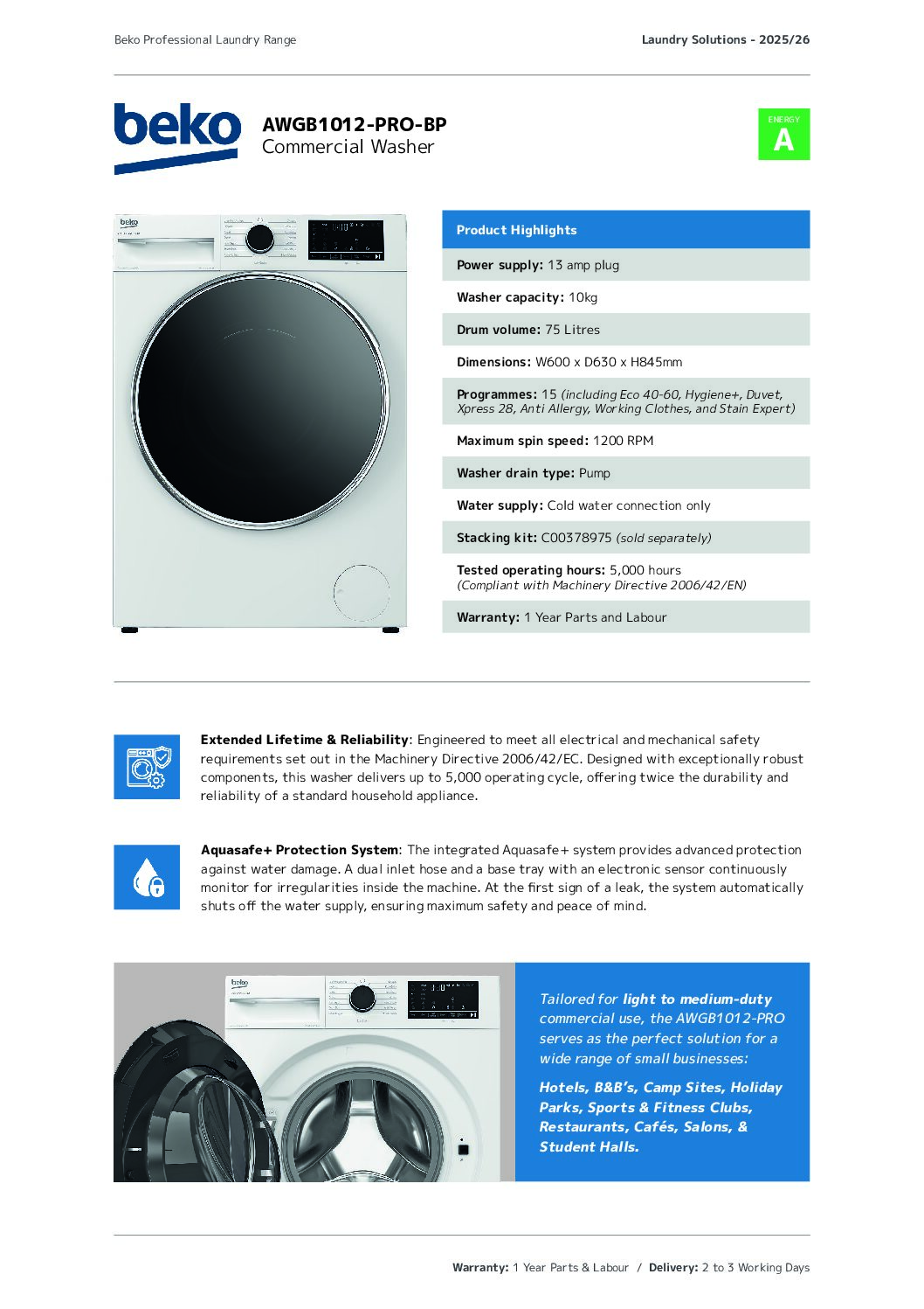 If you need a reliable on-site washer for daily staff uniforms, towels or regular service linen, the AWGB1012-PRO-BP is built to keep pace. With a 10kg load capacity, A-rated efficiency and a fast 28-minute express cycle, it helps you stay on top of laundry without tying up space or time.