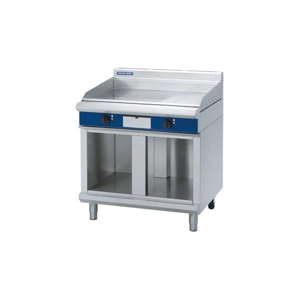 Blue Seal EP516-RB 900mm Electric Griddle with Refrigerated Base.  Offers compact, yet powerful and reliable performance alongside versatility thanks to its 1/3rd ribbed griddle. With a powerful 12kW thermostatic element controlled by heavy duty dial controls, the Blue Seal can easily cope with busy breakfast, lunch and dinner services, whilst still being easy to operate and simple to clean.