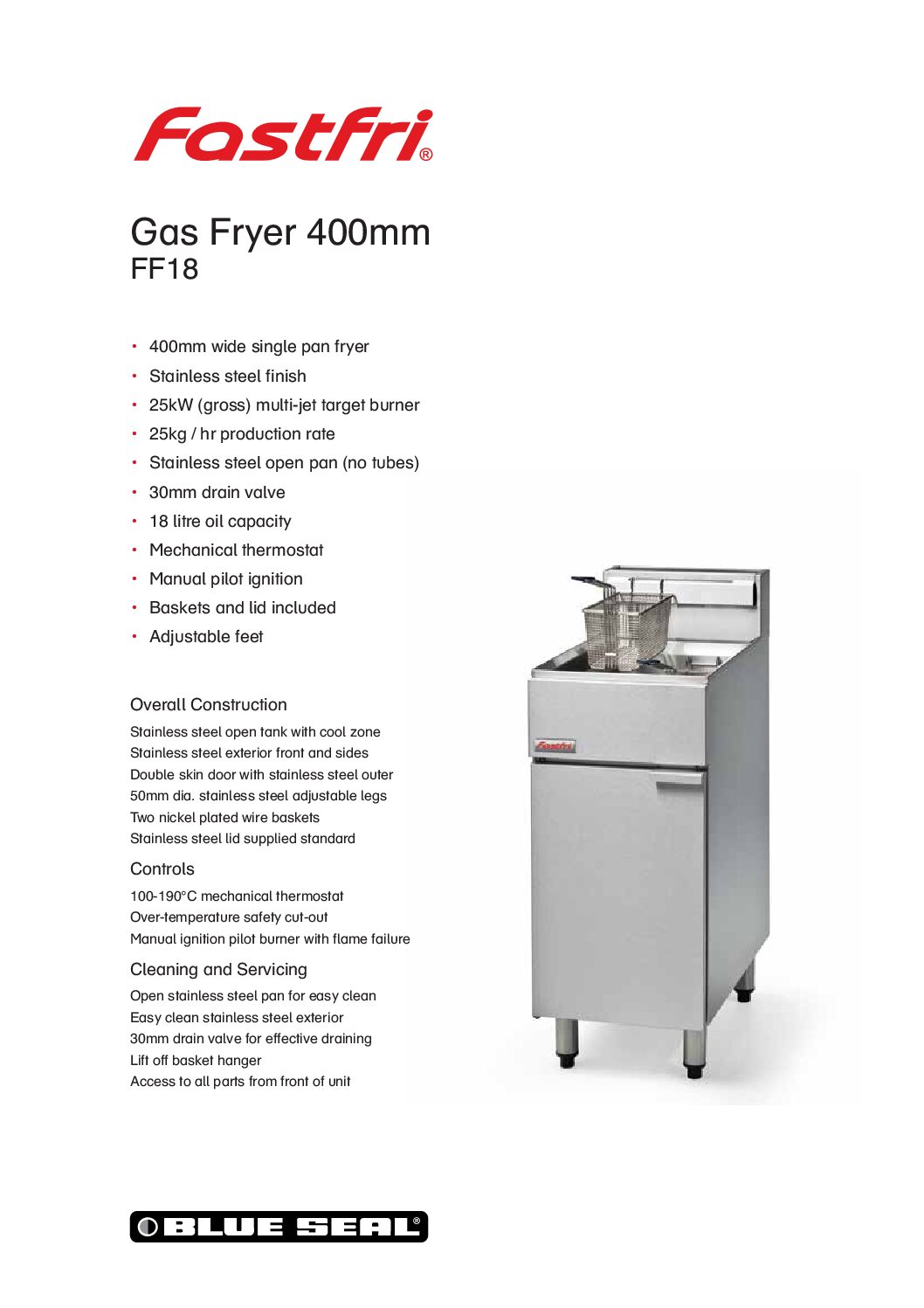 Blue Seal FastFri FF18 Single Tank Gas Fryer 18L is an impressive and economical new 18-litre gas fryer. Incorporate it seamlessly into a new kitchen or use its compact 400mm width to replace an existing fryer without hassle. Priced economically, the FF18 boosts fuel efficiency, helping business owners cut daily operating costs.