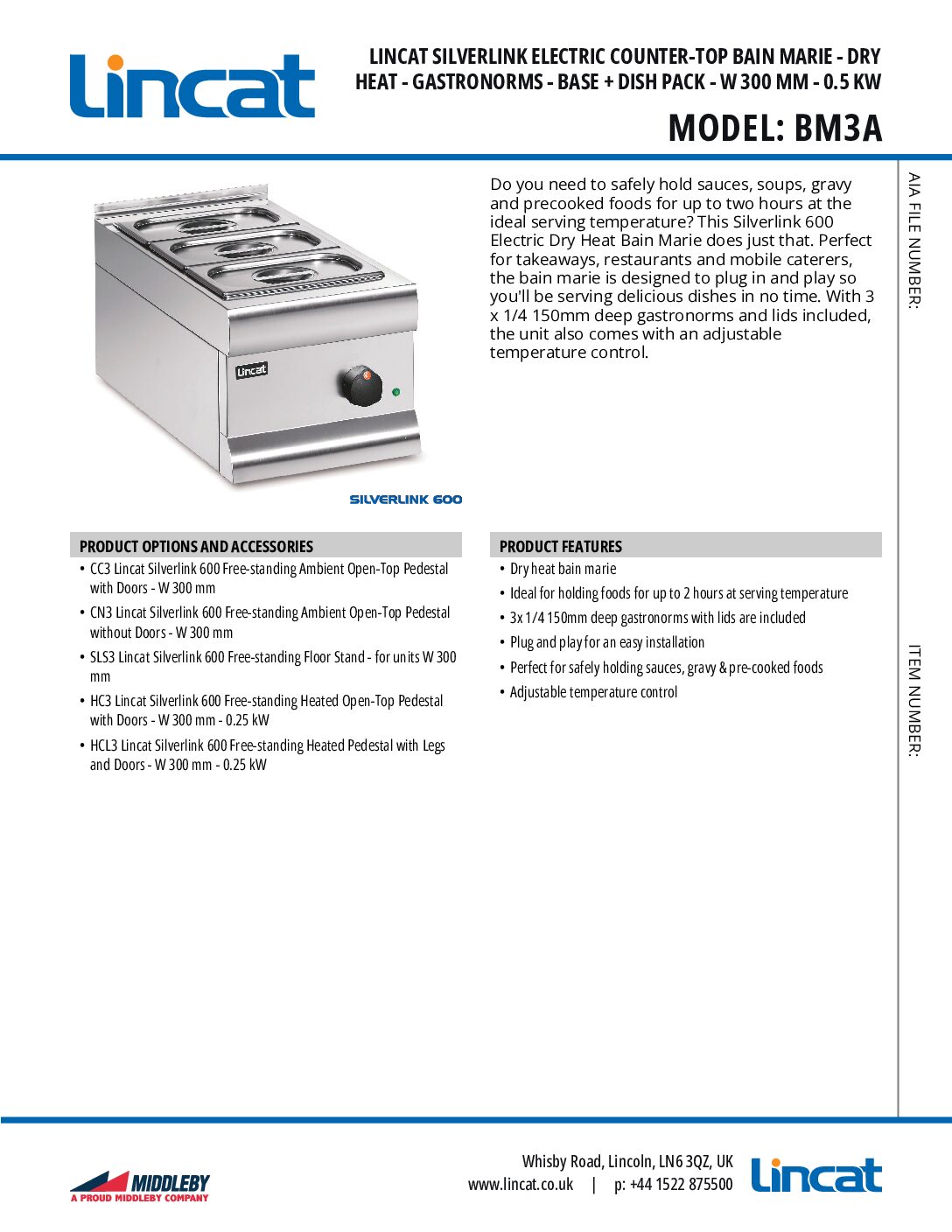 Lincat BM3A Dry Heat Electric Bains Marie is part of the Lincat Silverlink range which is modular 600mm deep prime cooking equipment. (light-medium duty) This range is extensive and includes gas and electric cooking equipment for both counter-top and free-standing use. All units are 600mm deep to make optimum use of available kitchen space. Width sizes extend from a compact 300mm up to 900mm, depending on the product type.