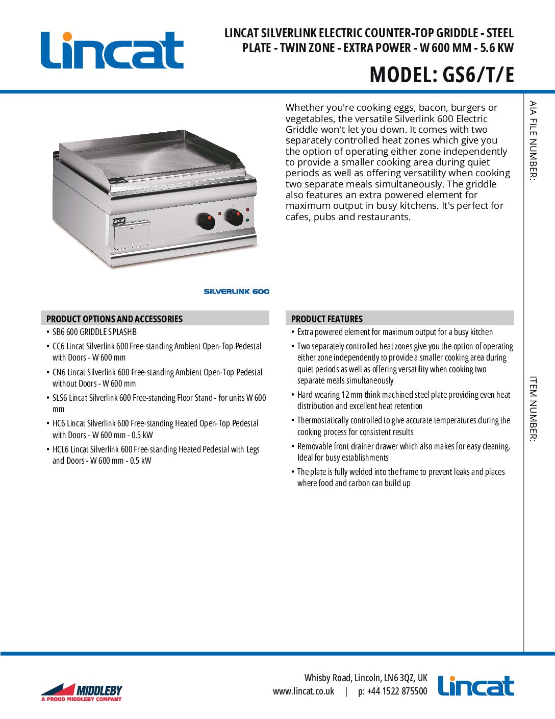 Lincat GS6/T/E Machine Plate Steel Electric Griddle is part of the exceptional Silverlink 600 range, featuring solid machined steel plate, twin thermostatic temperature controls, integral splashguard and nitrile rubber feet as standard. (/T) denotes dual cooking zones, (/E) models are supplied with extra power.
