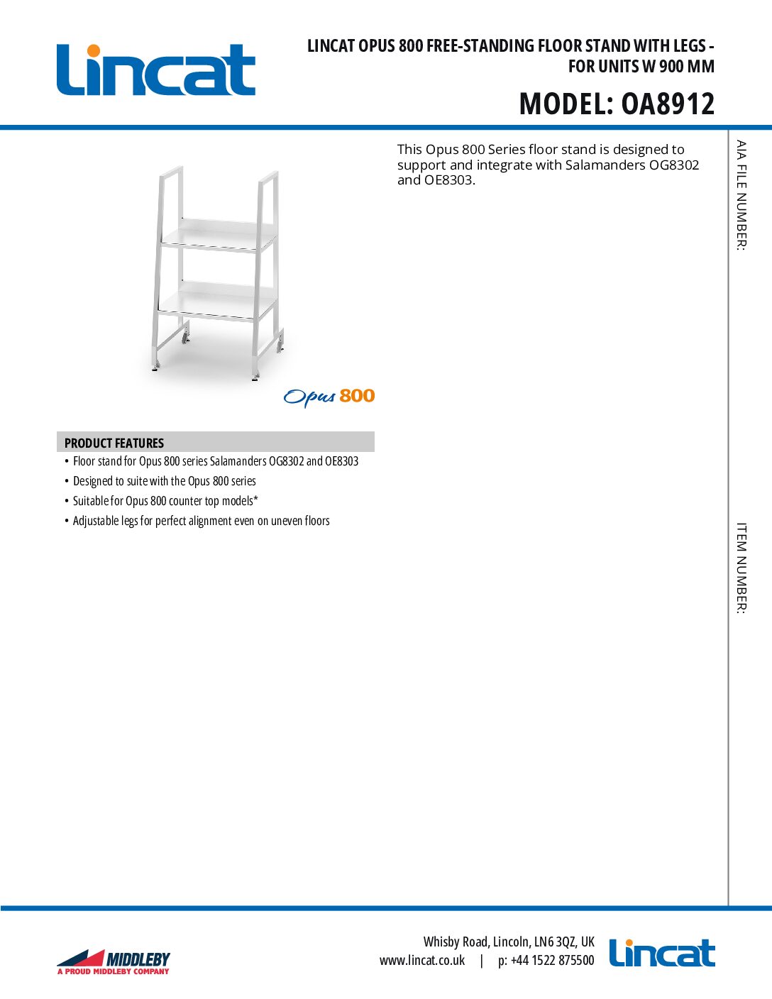 The Lincat OA8912 Floor Stand is designed to provide secure support for the Lincat OG8302 gas salamander grill and OE8304 electric salamander grill. Built with strength and stability in mind, this stand positions the grill at an ergonomic working height while offering additional shelving and storage space below. A practical solution for busy kitchens requiring both efficiency and durability.