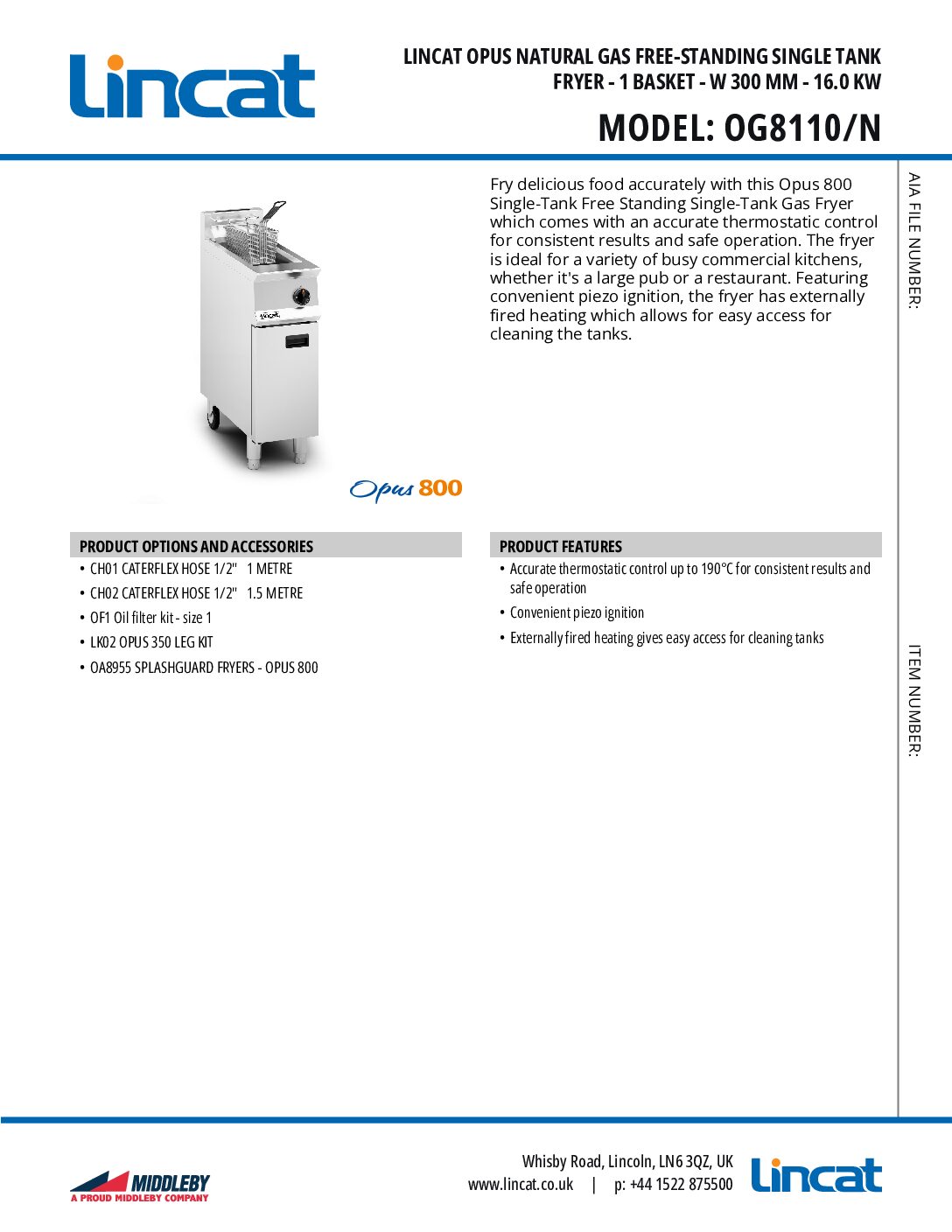 The Lincat OG8110 Single Tank Gas Fryer, 300mm wide, 14L Oil Capacity is part of the Opus 800 range and comes with 2 years parts and labour warranty as standard.