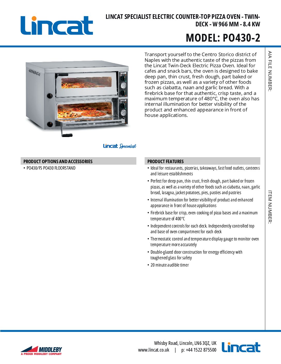 Lincat PO430-2 Premium Twin Deck Pizza Oven is part of the range of Lincat pizza ovens ideal for restaurants, pizzerias, takeaways, cafés and fast food outlets. The Lincat Premium  PO430-2 is a high quality oven featuring a firebrick base for crisp even cooking, they are perfect for deep pan, thin crust fresh dough part baked or frozen pizzas.
