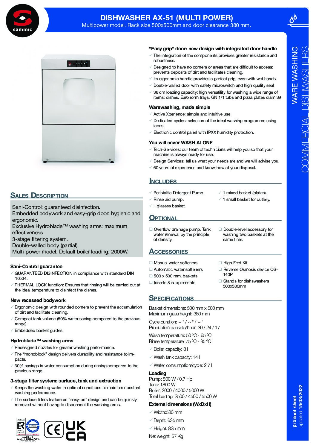 SAMMIC Active AX-51 Dishwasher, 500mm Basket (Multi Power)