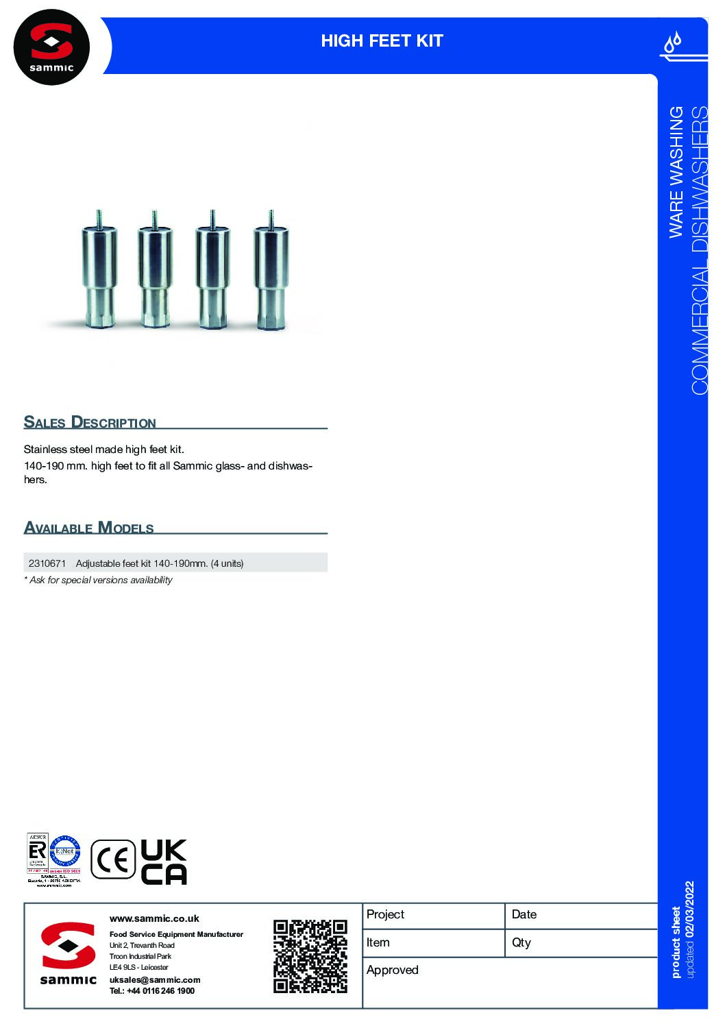 Sammic High Feet Kit for Glasswashers and Dishwashers are part of the range of quality accessories by Sammic.