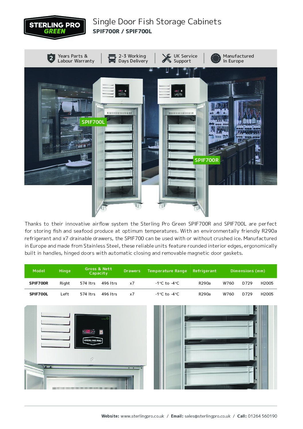 Purpose-built for fresh fish and seafood. The Sterling Pro Green SPIF700 provides precise -1 °C to -4 °C storage with a hygienic stainless-steel interior and seven pull-out trays. Optimised airflow prevents drying while maintaining safe temperatures, and the cabinet can be used with or without crushed ice depending on your operation.