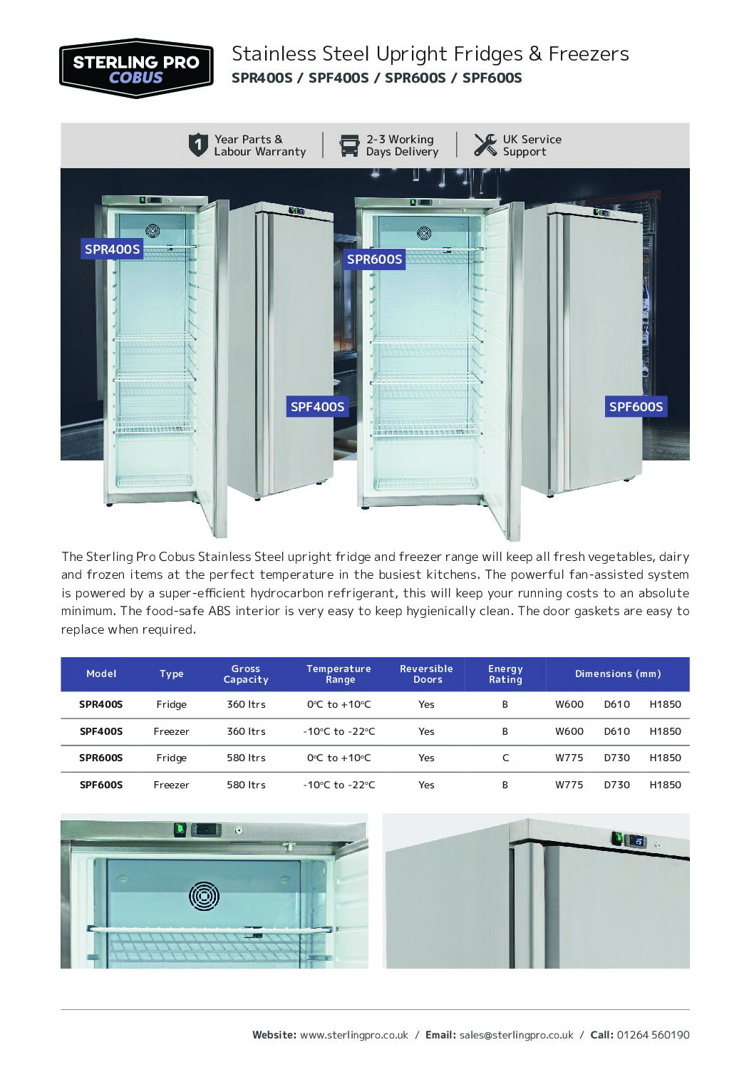 Sterling Pro SPR400S Single Door Stainless Steel Upright Refrigerator 360L is constructed of catering-grade stainless steel and is part of the Stirling Pro Cobus range of undercounter and upright fridges and freezers of varying capacities, ideal for most food preparation areas.