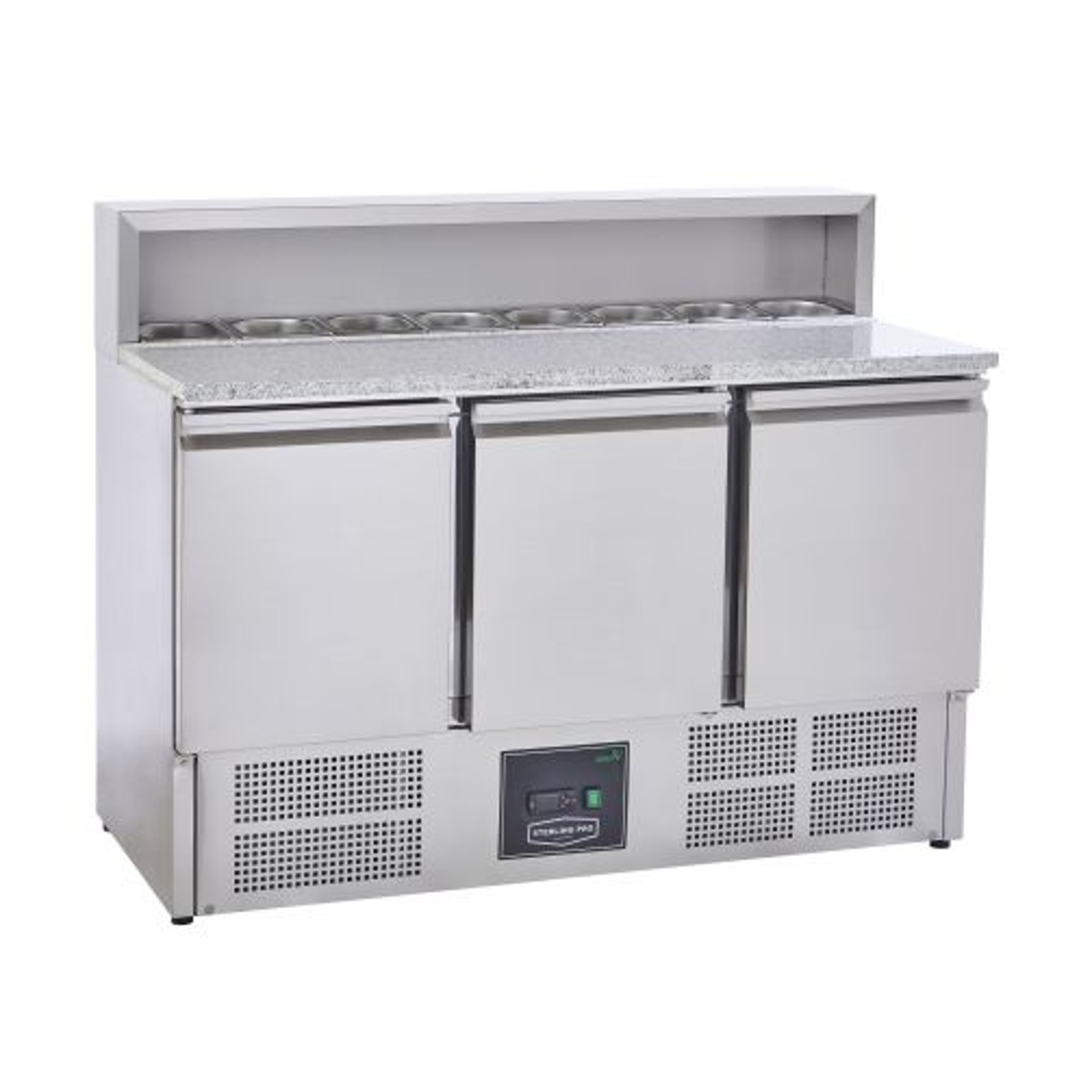 Designed for speed, precision and hygiene — the Sterling Pro Cobus SPU903PZ is a professional pizza prep counter that combines refrigerated storage, a granite work surface, and an integrated chilled ingredient rail. Built for busy kitchens, the granite top provides the perfect surface for rolling and topping bases, while the rear-mounted rail keeps up to 8 × GN 1/6 pans of fresh ingredients within easy reach (pans not included).