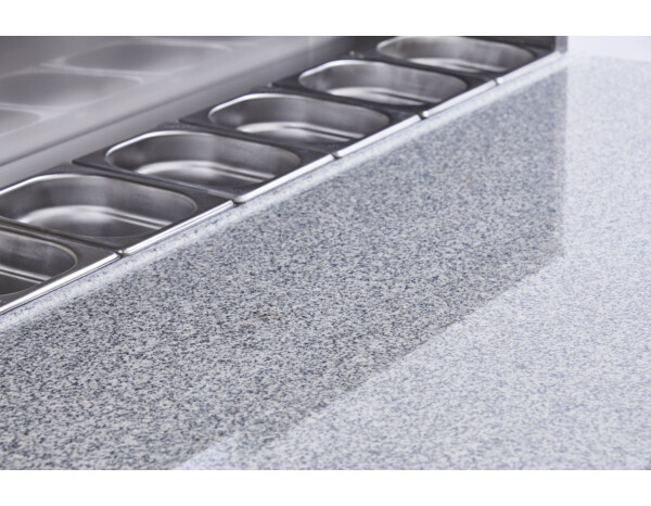 - Granite-top pizza counter with rear refrigerated topping rail (8 × GN 1/6 — pans not included).